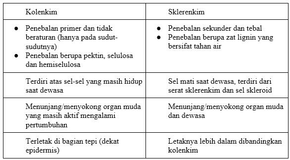 Jaringan kolenkim berfungsi sebagai penguat sel-sel dewasa sementara jaringan sklerenkim berfungsi sebagai penyokong organ-organ muda