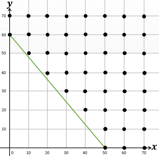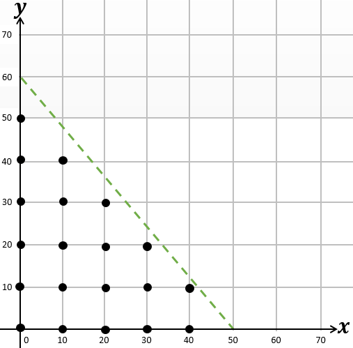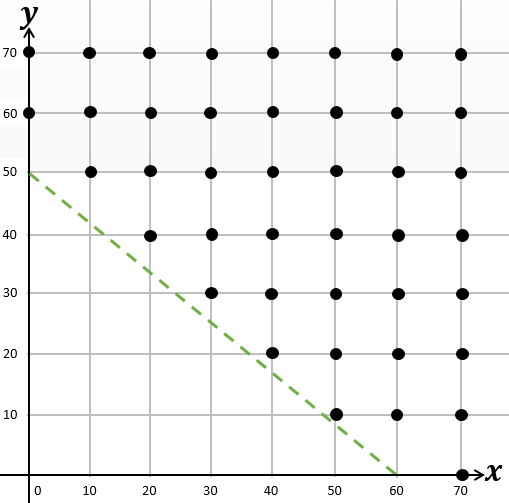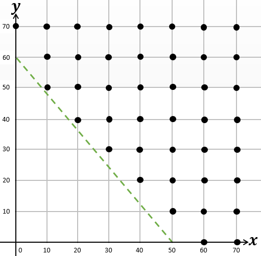 Perpustakaan memiliki koleksi buku dalam negeri dan luar negeri. Diketahui terdapat 6 rak berisi penuh buku dalam negeri dan 5 rak berisi penuh buku luar negeri. Setelah dilakukan perhitungan, jumlah buku dalam negeri dan luar negeri lebih dari 300 buku. Gambar pertidaksamaan beserta daerah penyelesaiannya yang menggambarkan kondisi di atas adalah ....