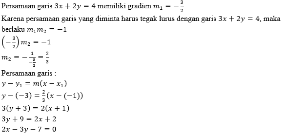 Persamaan garis yang melalui titik (-1, -3) dan tegak lurus garis 3x + 2y = 4 adalah…