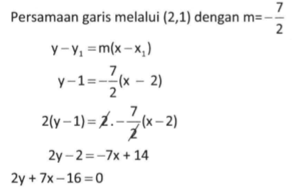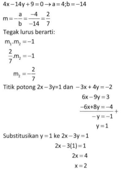 Persamaan garis yang tegak lurus dengan 4x -14y + 9 = 0 dan melalui titik potong 2x - 3y = 1 dan -3x + 4y = -2 adalah ...