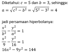 Persamaan hiperbola yang berpusat di O(0,0) dengan fokus di , dan puncaknya adalah….