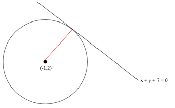 Persamaan lingkaran yang berpusat di titik (-1, 2) dan menyinggung garis x + y + 7 = 0 adalah ....