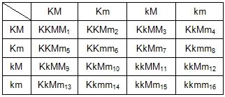 Persilangan antara dua sifat yang berbeda disebut dengan persilangan dihibrid. Berdasarkan soal tersebut, tanaman bunga berwarna kuning dan berbuah manis dapat kita asumsikan memiliki genotipe KKMM, sedangkan tanaman bunga putih berbuah asam dapat kita asumsikan memiliki genotipe hhmm. Gen K (kuning) bersifat dominan terhadap gen k (putih), sedangkan gen M (rasa manis) bersifat dominan terhadap gen m (rasa asam). Persilangan untuk mendapatkan keturunan pertama (F1) dapat dijabarkan sebagai berikut.