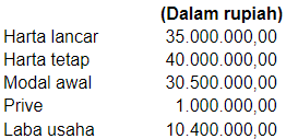 Perusahaan jasa Mantab body repair mencatat harta lancar Rp35.000.000,00, harta tetap Rp40.000.000,00, modal awal Rp30.500.000,00, pengambilan prive Rp1.000.000,00, dan laba usaha Rp10.400.000,00. Besar kewajiban yang tercatat dalam neraca adalah ....