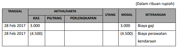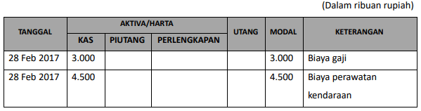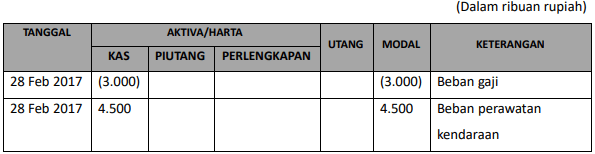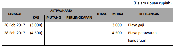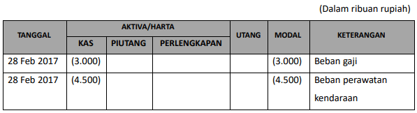 Perusahaan jasa pengiriman “Ekspres” membayar gaji karyawan pada tanggal 28 Februari 2018 sebesar Rp3.000.000,00 dan beban perawatan kendaraan operasional sebesar Rp4.500.000,00. Pencatatan transaksi tersebut terhadap persamaan dasar akuntansi adalah ….