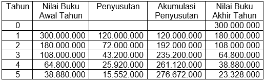 Perusahaan Kayu Royo, sebuah perusahana pedagang besar perabotan, memperoleh peralatan kayu dengan biaya Rp300.000.000 pada awal tahun fiskal. Peralatan tersebut memiliki estimasi masa manfaat lima tahun dan estimasi nilai sisa sebesar Rp24.000.000.