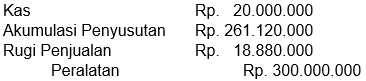 Diasumsikan bahwa peralatan disusutkan menggunakan metode saldo menurun ganda. Pada minggu pertama tahun ke-5, peralatan dijual sebesar Rp20.000.000. Buatlah ayat jurnal untuk mencatat pertukaran tersebut.
