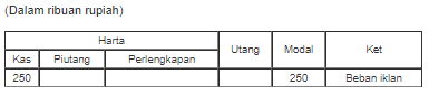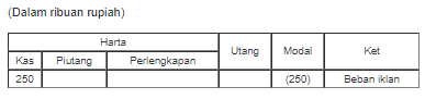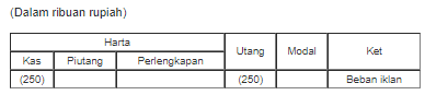 Perusahaan membayar biaya iklan sebesar Rp250.000,00. Pencatatan transaksi pada persamaan dasar akuntansi yang tepat adalah ….
