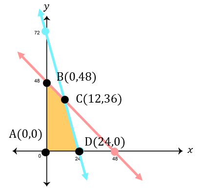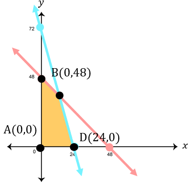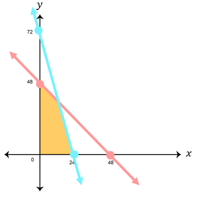 ⎩ ⎨ ⎧ x + y ≤ 48 3 x + y ≤ 72 x ≥ 0 y ≥ 0