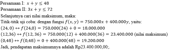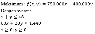 Pesawat penumpang mempunyai tempat duduk 48 kursi. Setiap penumpang kelas utama boleh membawa bagasi 60 kg, kelas ekonomi 20 kg. Pesawat hanya dapat membawa bagasi 1.440 kg. Harga tiket kelas utama adalah Rp750.000,00 dan kelas kelas ekonomi adalah Rp400.000,00. Pendapatan maksimum pada saat pesawat penuh adalah ...