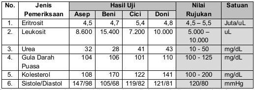 Petugas Palang Merah Indonesia (PMI) memiliki data calon pendonor darah yaitu, Asep, Beni, Cici, dan Doni. Berikut ini adalah hasil uji laboratorium pada 4 orang calon pendonor darah tersebut.