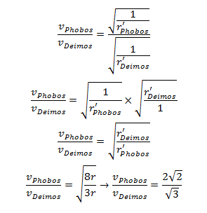 Planet Mars mempunyai dua satelit alami, yaitu Phobos dan Deimos. Satelit Phobos terletak pada jarak 3r dari pusat planet Mars dan satelit Deimos terletak pada jarak 8r dari pusat planet Mars, dengan r adalah jari-jari planet Mars. Perbandingan kelajuan satelit Phobos dengan satelit Deimos ketika mengorbit planet Mars adalah .…