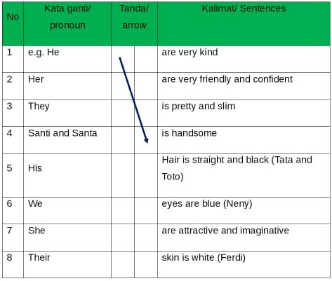 Please complete the table below based on correct sentences. (Setelah kalian mengisi tabel di atas apakah kalian bisa menangkap makna terkait unsur kebahasaan pada teks deskriptif. Kalau sudah bisa silakan kalian lakukan kegiatan berikut: tariklah tanda panah dari kata ganti menuju kata yang dirujuk sesuai unsur kebahasaan.)
