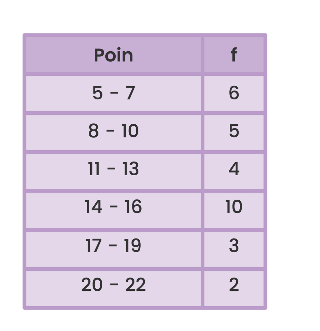 Poin yang dicetak seorang pemain basket selama beberapa pertandingan disajikan dalam tabel berikut.