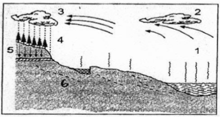 Proses evaporasi dan presipitasi dari siklus hidrologi pada gambar ditunjukkan angka ….