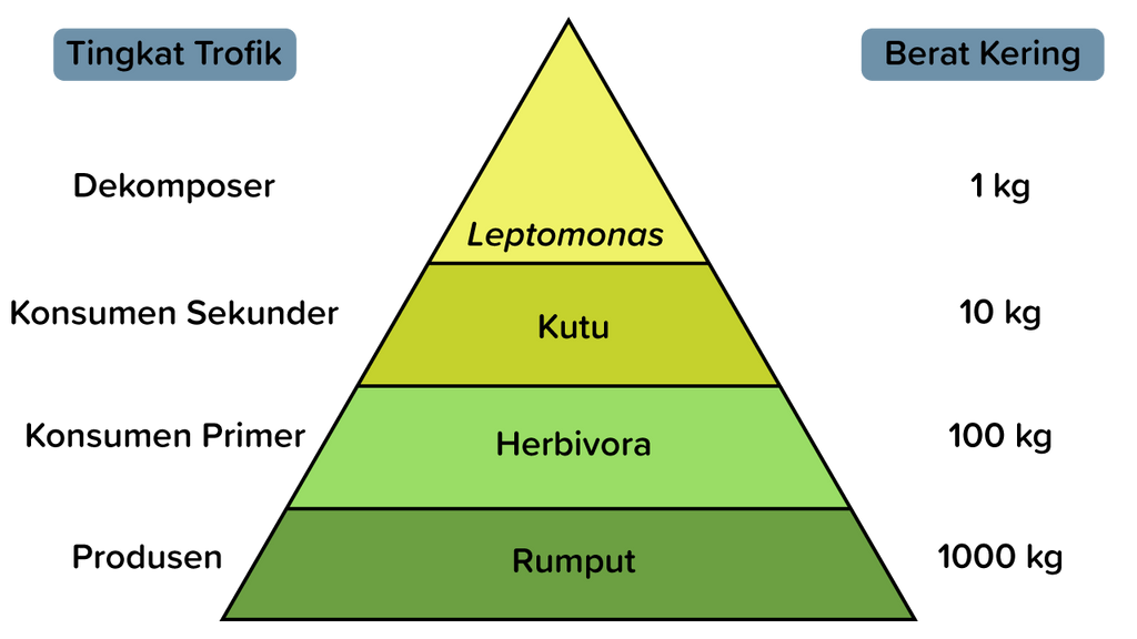 Protozoa Leptomonas hidup parasit pada kutu. Contoh rantai makanan yang melibatkan Leptomonas sebagai berikut. Rumput - herbivora - kutu - Leptomonas. Berdasarkan rantai makanan tersebut, gambarlah piramida jumlahnya dan jelaskan!