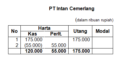 PT Intan Cemerlang meminjam uang di bank sebesar Rp175.000.000,00 dan membeli peralatan kantor sebesar Rp55.000.000,00. Saldo akhir yang benar pada persamaan akuntansi adalah ...