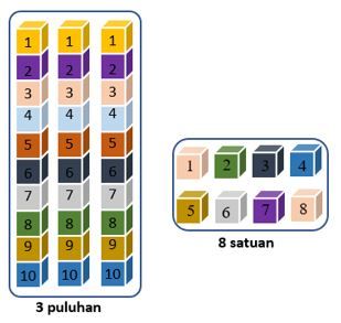 3 puluhan, 8 satuan
