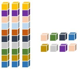Puluhan dan satuan pada bilangan yang ditunjukkan pada gambar kubus-kubus berwarna ini adalah ....