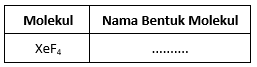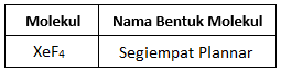 Sehingga, pada molekul XeF4 terdapat 4 buah PEI dan 2 buah PEB atau notasinya AX4E2 sehingga bentuk molekulnya segiempat plannar.