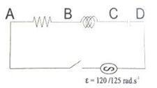 Rangkaian RLC seri dirangkaikan seperti pada gambar. Diketahui nilai , L = 32 mH. Bila saklar S ditutup, beda potensial antara titik B dan D adalah ...