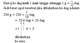 Rani mengukur berat sebuah apel menggunakan timbangan. Berat apel tersebut adalah 256 g. Jika dinyatakan dalam satuan dag terdekat, berat apel tersebut adalah ....