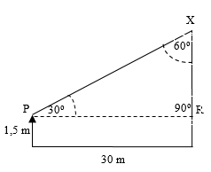 Ravi sedang mengamati pertumbuhan pohon jati, jarak Ravi terhadap pohon jati adalah 30 meter. Jika Ravi mempunyai tinggi 1,5 meter dan arah pandang Ravi bersudut elevasi 30o terhadap pohon jati tersebut, maka tinggi pohon jati tersebut adalah...