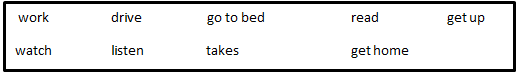 I'm very busy these days. I think I need more free time. I always 1) ____ at 7.15 a.m. Then, I eat breakfast and get ready for work till around 8.45 a.m. I 2) ____ to work. It 3) ____ about 20 minutes. I usually 4) ____ from 9 a.m to 5 p.m, but sometimes I have to work overtime. My lunch break is from 12 p.m to 1 p.m. I often go to the health club to work out after work for an hour or so, and I usually 5) ____ around 6.30 p.m. or 7 I have dinner, work at my computer for a while, and 6) ____ some books. I hardly ever 7) ____ TV. I usually 8) ____ at 11 p.m. during the week, but till 12 a.m. or 1 a.m. on weekends. So much to do, so little time.
