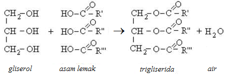 Reaksi esterifikasi menghasilkan lemak. Reaksi tersebut berasal dari gliserol dan….
