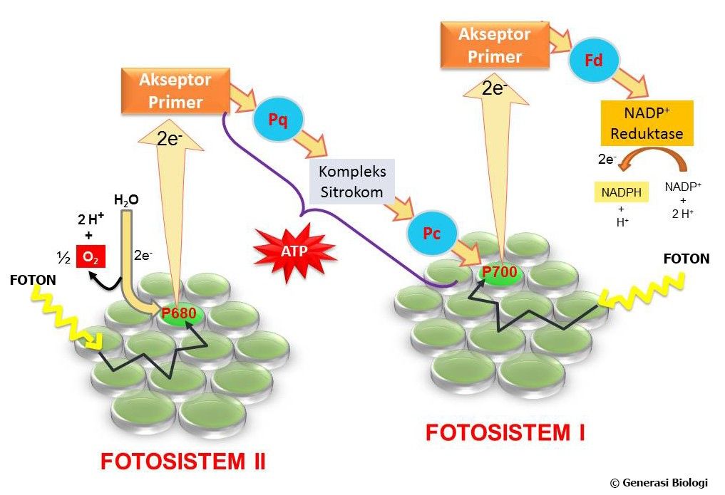 Reaksi terang menggunakan tenaga matahari untuk menghasilkan ATP dan NADPH, yang masing-masing menyediakan energi kimiawi dan tenaga reduksi untuk reaksi pembuatan gula dalam siklus Calvin. Selama reaksi terang fotosintesis, terdapat dua rute untuk aliran elektron yaitu siklik dan nonsiklik. Perhatikan skema perjalanan elektron nonsiklik selama reaksi terang di bawah ini!