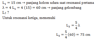 Resonansi pertama pada sebuah kolom udara terjadi saat panjang kolom tersebut 15 cm, maka panjang kolom udara saat resonansi ketiga adalah ....