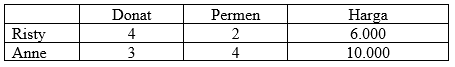 Risty membeli 4 donat dan 2 permen seharga Rp6.000,00. Anne membeli 3 donat dan 4 permen dengan harga Rp10.000,00. Harga satu buah permen adalah....