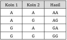 Ruang sampel dari pelemparan dua buah koin dengan sisi angka (A) dan gambar (G) adalah ....