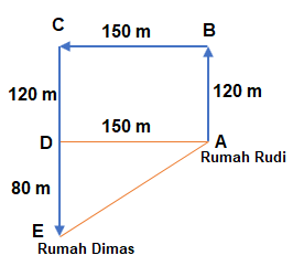 Rudi bersepeda dari rumahnya ke rumah Dimas. Rudi mengambil lintasan ke arah utara sejauh , lalu ke arah barat sejauh , selanjutnya ke arah selatan sejauh . Jarak antara rumah Rudi dan Dimas adalah ....
