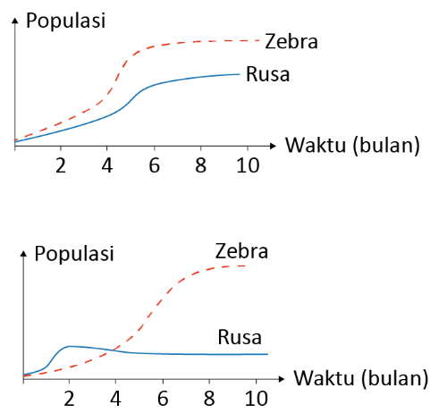Grafik atas (grafik A) menunjukkan pertumbuhan populasi ketika rusa dan zebra terpisah relung, sedangkan grafik bawah (grafik B) menunjukkan pertumbuhan populasi rusa dan zebra ketika menempati relung yang sama. Berdasarkan grafik di atas, maka hubungan yang tepat antara rusa dan zebra adalah ….