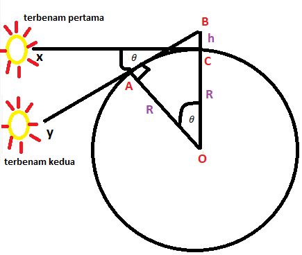 Saat matahari mulai menghilang dari pandangan Salman yang sedang tiduran, Salman langsung berdiri sambil menyalakan stopwatch (mata Salman naik 1,62 meter dari pandangan semula). Nah saat salman berdiri dia masih bisa melihat matahari, namun setelah itu matahari kembali menghilang dari pandangannya sehingga dia langsung mematikan stopwatch. Jika waktu yang tercatat di stopwatch adalah 10 detik, maka berapakah jari-jari bumi?