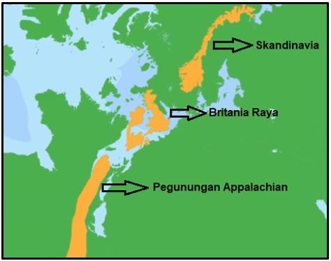 kemiripan fitur geologi pada jalur Pegunungan Appalachian, Afrika Barat, Britania Raya, dan Skandinavia