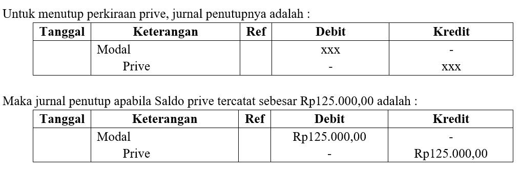 Saldo prive tercatat sebesar Rp125.000,00. Jurnal penutupnya adalah…