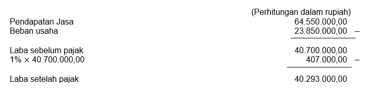 Salon Ayu memperoleh pendapatan jasa sebesar Rp64.550.000,00. Pada waktu bersamaan beban usaha yang dikeluarkan Rp23.850.000,00. Jika tarif pajak ditetapkan 1% dari pendapatan jasa, laba bersih setelah pajak sebesar ....