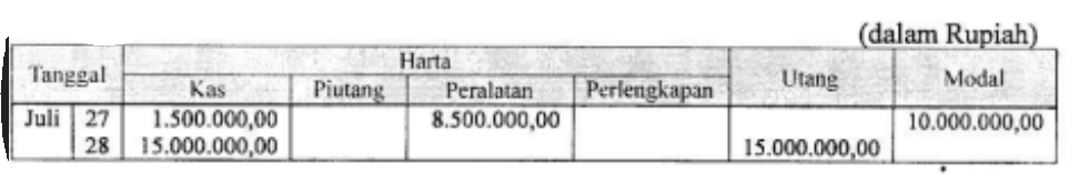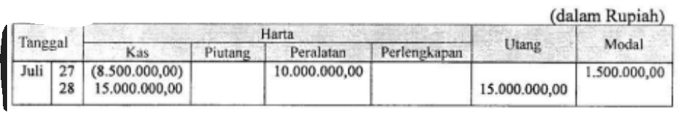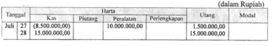 Tanggal 27 Juli 2012 : Membeli peralatan salon seharga Rp10.000.000,00 dibayar tunai sebesar Rp8.500.000,00 sisanya dibayar kemudian