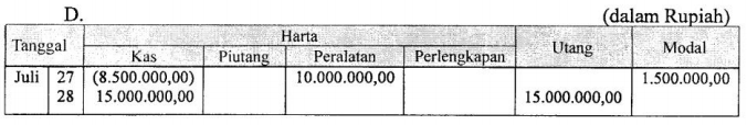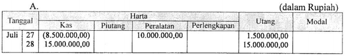Tanggal 27 Juli 2012 : Membeli peralatan salon seharga Rp10.000.000,00 dibayar tunai sebesar Rp8.500.000,00 sisanya dibayar , kemudian