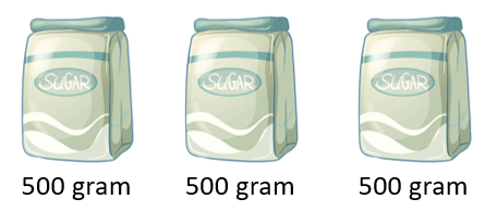 Sasa memiliki 3 buah kantong yang berisi gula. Setiap kantong berisi 500 gram gula. Total gula yang Sasa punya adalah … gram.