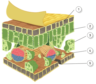 Preparat yang diamati oleh Sasa merupakan jaringan pada … yang tersusun atas jaringan palisade yang ditunjukkan oleh nomor … dan jaringan spons yang ditunjukkan oleh nomor ... yang berperan dalam fotosintesis.