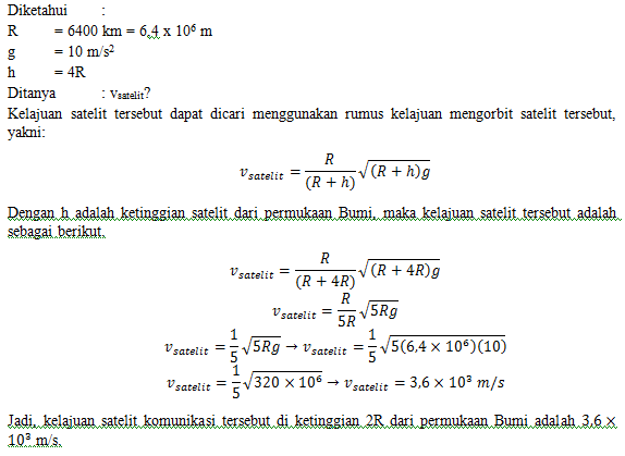 Satelit mengorbit pada jarak 4 kali jari-jari Bumi yang dihitung dari permukaan Bumi. Jika jari-jari Bumi adalah 6400 km dan percepatan gravitasi Bumi adalah 10 m/s2, maka kelajuan satelit tersebut adalah .…
