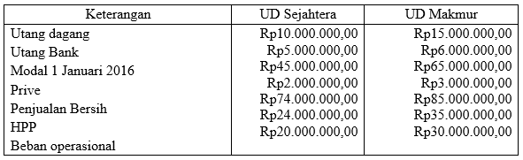 Sebagian data keuangan UD Sejahtera dan UD Makmur pada akhir periode adalah sebagai berikut.