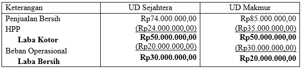 Laba bersih UD Sejahtera 2 kali lebih besar dibandingkan UD Makmur