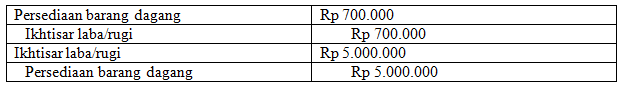 Kas Rp2.900.000,00 persediaan barang dagang Rp5.000.000,00, perlengkapan Rp 1.400.000,00, kendaraan Rpl3.000.000,00. Data penyesuaian per 30 April 2015 persediaan barang dagang akhir sebesar Rp700.000,00 dan perlengkapan yang terpakai sebesar Rp500.000,00. Ayat jurnal penyesuaian yang benar berdasarkan pendekatan ikhtisar laba/rugi adalah ….