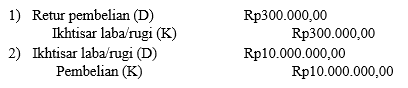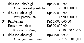 Sebagian data yang terdapat dalam kertas kerja UD Sanji meliputi pembelian Rp10.000.000,00, retur pembelian Rp300.000,00, beban angkut pembelian Rp500.000,00, dan beban gaji karyawan Rp2.500.000,00. Berdasarkan kertas kerja sebagian tersebut, jurnal penutup yang dibuat oleh UD Sanji sebagai berikut.