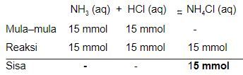 Sebanyak 100 mL 0,15 M direaksikan dengan 50 mL HCl 0,3 M, pada akhir reaksi larutan akan memiliki pH = 5