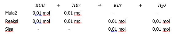 Sebanyak 100 ml larutan KOH 0,1 M ditambahkan ke dalam 100 ml larutan HBr 0,1 M. Jika terjadi perubahan suhu dari 25 ˚C menjadi 32 ˚C, maka besarnya perubahan entalpi reaksi netralisasi tersebut adalah … (anggap ρlarutan = 1 g/ml dan c =4,2 J/K)
